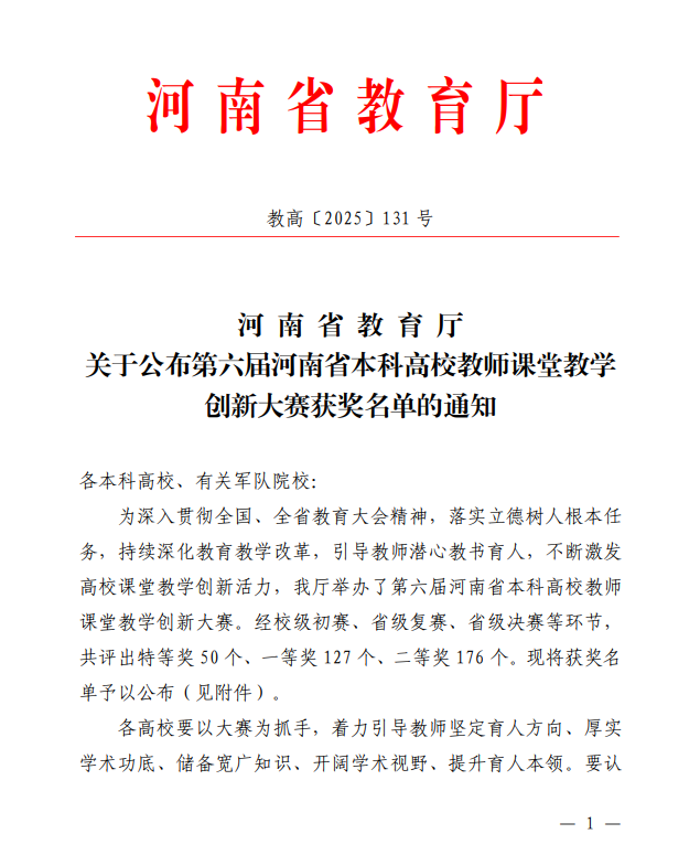近日,河南省教育厅下发《关于公布第六届河南省本科高校教师课堂教学创新大赛获奖名单的通知》(教高〔2025〕131号),我校艺术设计学院李妍副教授团队、管理学院刘文副教授团队获得一等奖,土木工程学院刘杨教师团队获得二等奖。